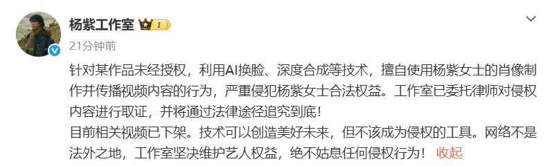 当日,杨紫工作室发文回应:针对某作品未经授权,利用AI换脸、深度合成等技术,擅自使用杨紫女士的肖像制作并传播视频内容的行为,严重侵犯杨紫女士合法权益。工作室已委托律师对侵权内容进行取证,并将通过法律途径追究到底!