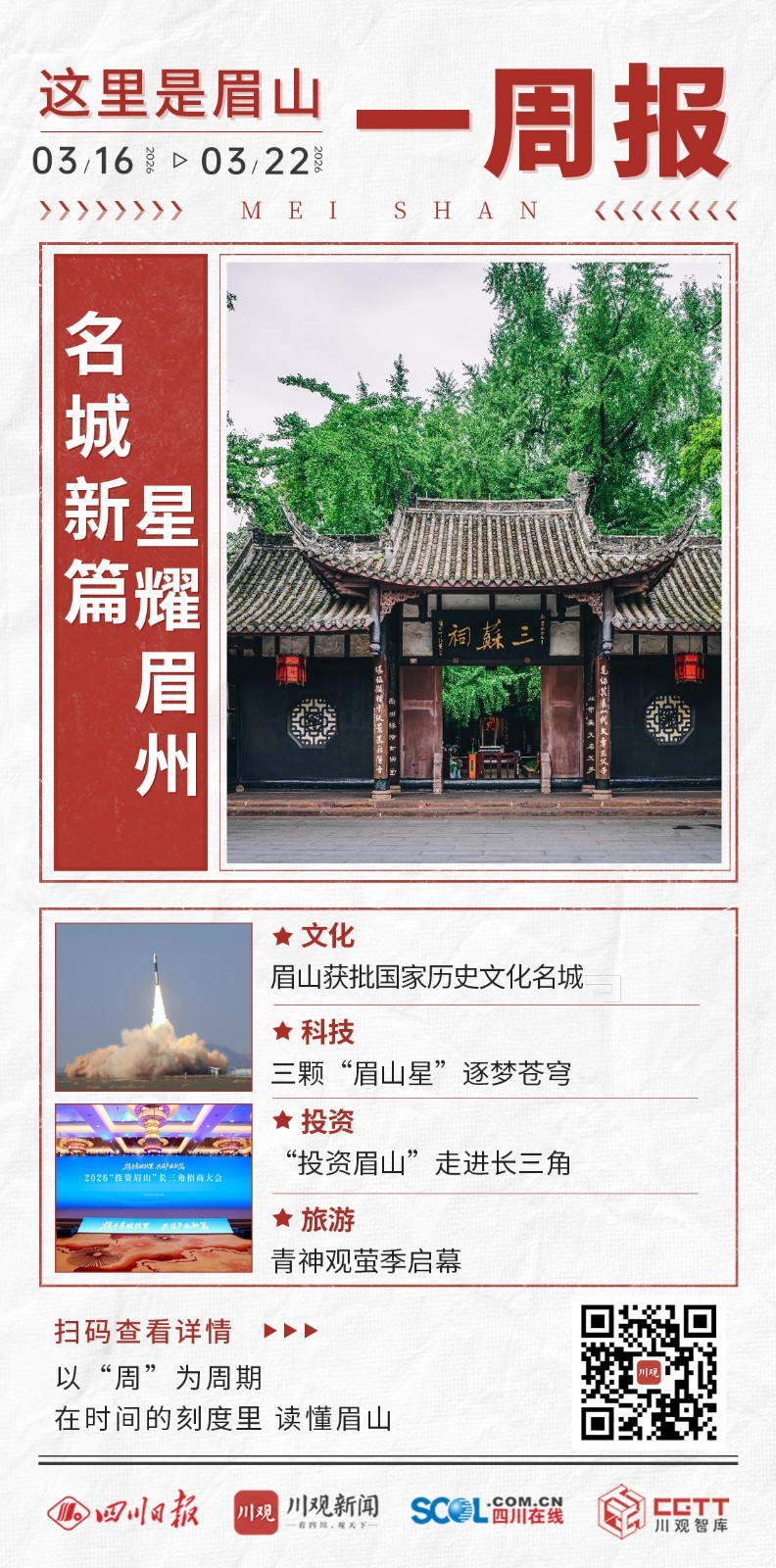 3月16日-22日,这一周,对眉山来说,最重磅的消息,莫过于眉山正式获批国家历史文化名城。从三苏文脉到江口沉银,从千年古祠到活态传承,这块金字招牌,是眉山城市文脉的最好注脚。