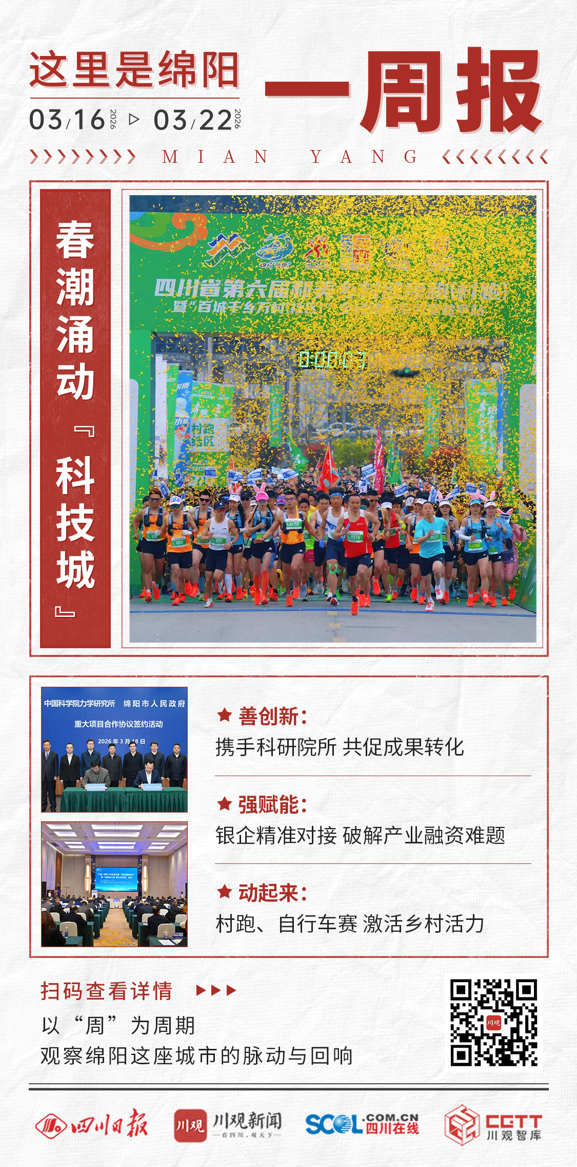 从“牵手”科研院所,到“银企鹊桥会”现场;从盐亭超2000人的村跑,到千余车轮碾过安州沃野;从两岸同胞共祭文昌祖庭,到绵阳春日里的繁花似锦——这一周的绵阳,既有专注科技创新与产业创新融合发展的发展定力,也有“体育+”点燃春季运动热情的“活力奔涌”,更有春日里“百花竞放”的浪漫诗意。