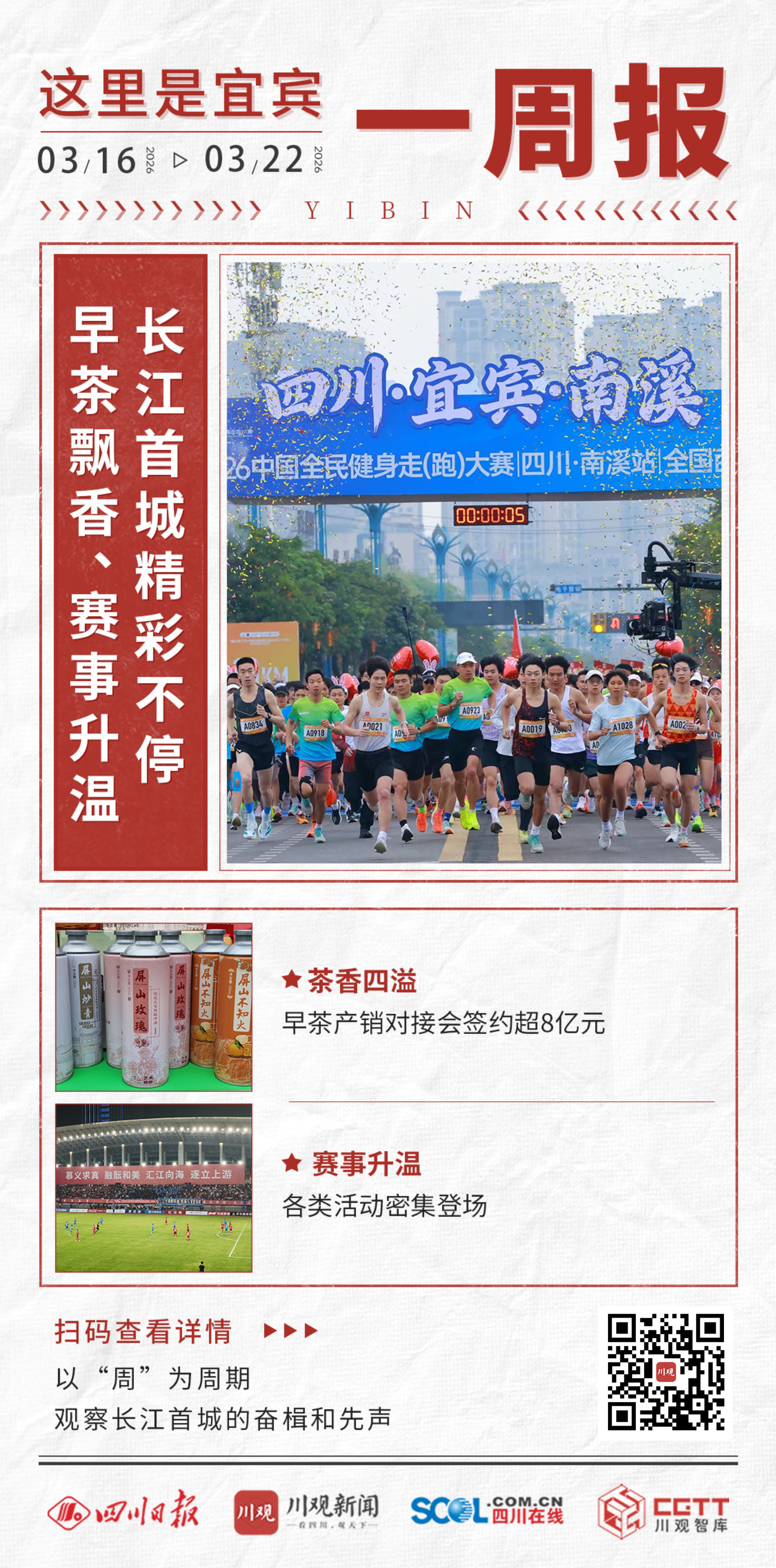 3月16日至22日,宜宾在产业经济、赛事经济等方面多点开花,热度持续攀升。早茶产销对接签约超8亿元、川超联赛第二阶段主场激战、大学生体育联赛启幕、全民健身赛事燃动南溪……一周之内,“长江首城”处处涌动蓬勃朝气,城市活力值拉满。