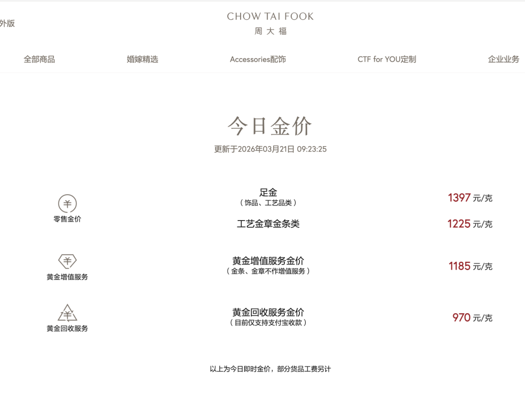 周大福的金饰价格从1447元/克回落至1397元,单日下跌50元。