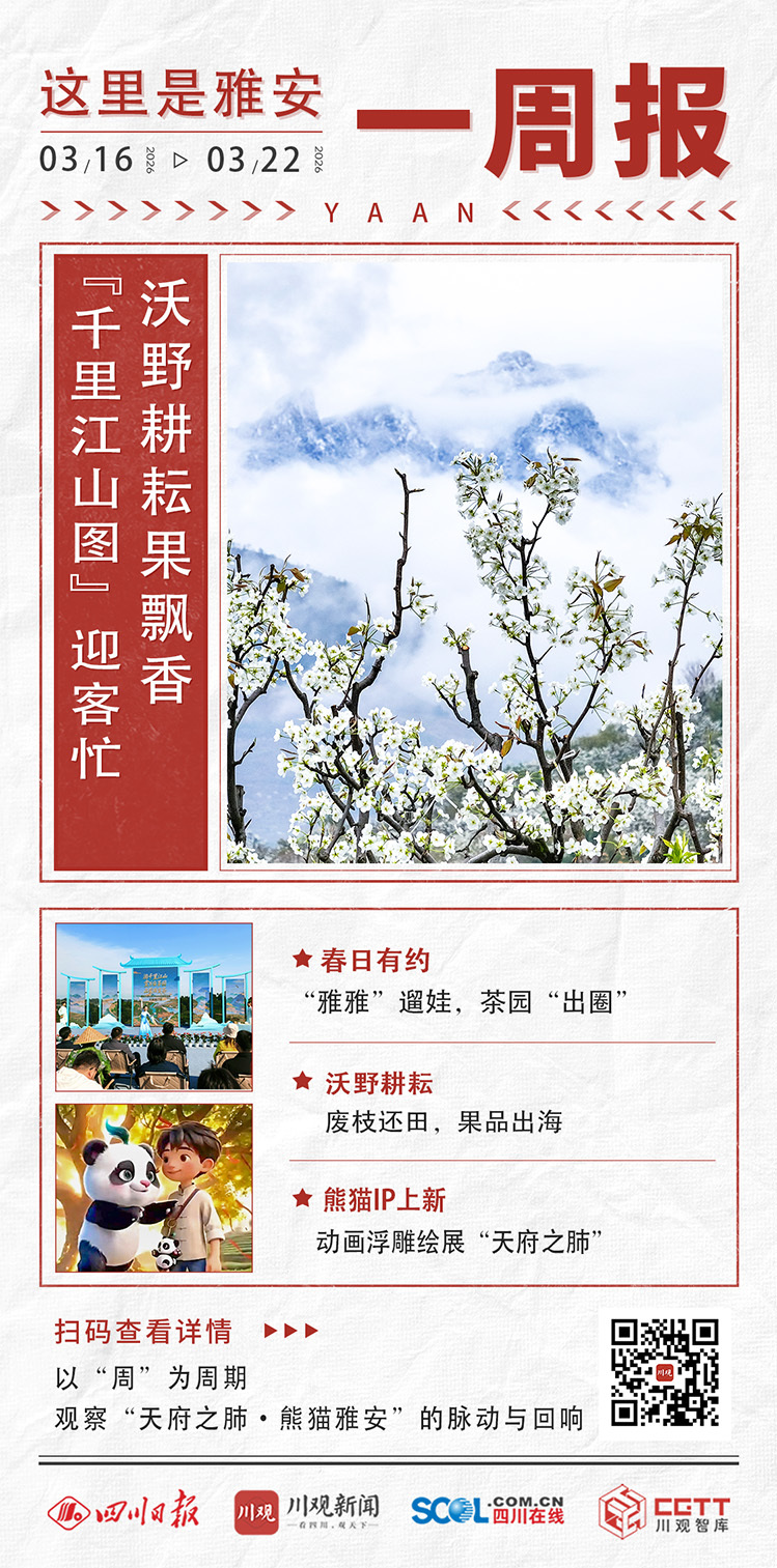 2026年3月16日至3月22日,这一周,雅安有点“火”。名山区因“现实版千里江山图”刷屏,游客扎堆打卡;城市吉祥物大熊猫“雅雅”升级当妈,带着幼崽遛弯的画面萌翻网友;汉源果农用废枝养出特级甜樱桃,大渡河畔黄果柑出口加拿大……从流量到留量,从田间到云端,雅安正用自己的方式“出圈”。