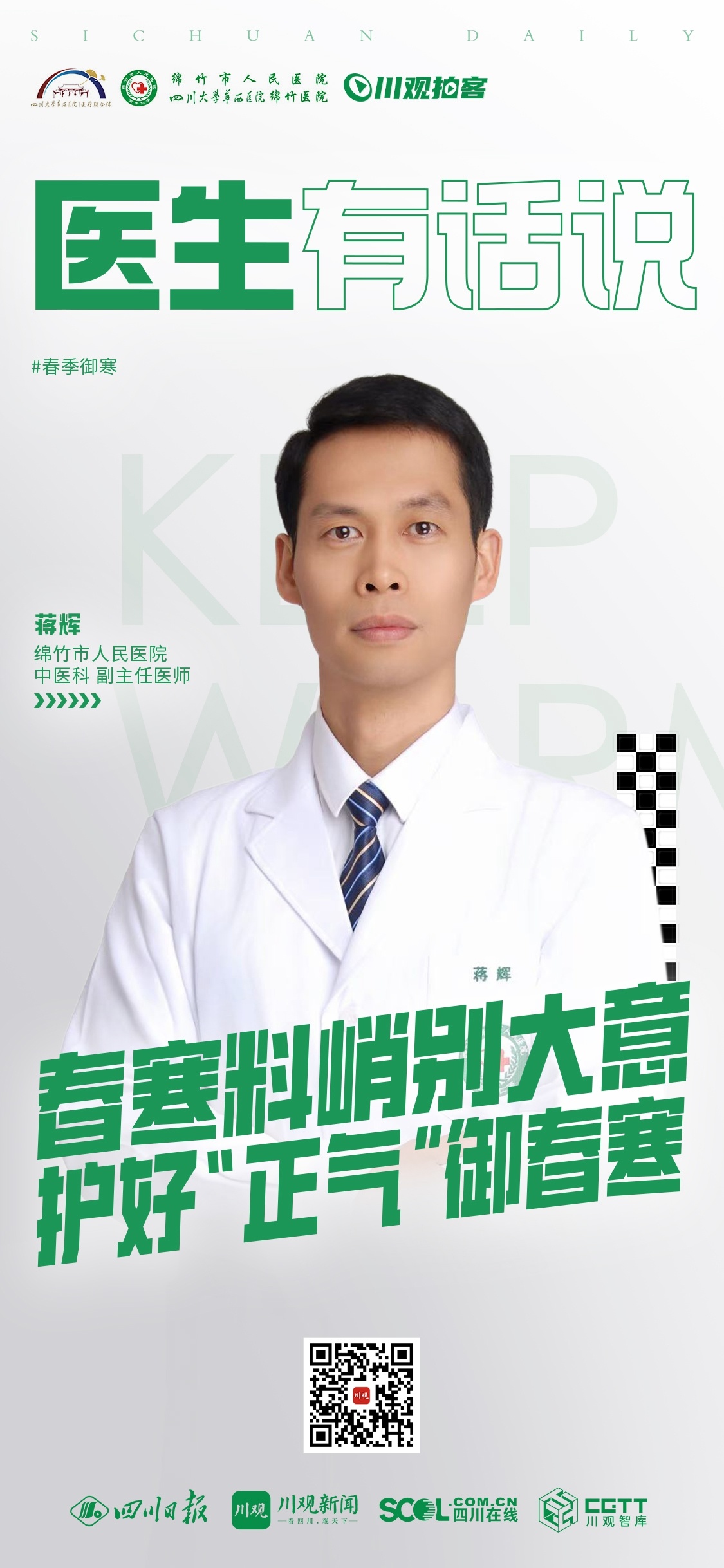 本期栏目,来自绵竹市人民医院中医科的副主任医师蒋辉,就跟大家分享如何预防春季受寒,增强抵抗力。