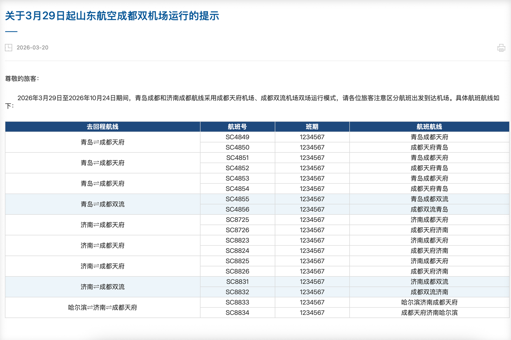 山东航空此前发布的成都“两场”运行消息的截图