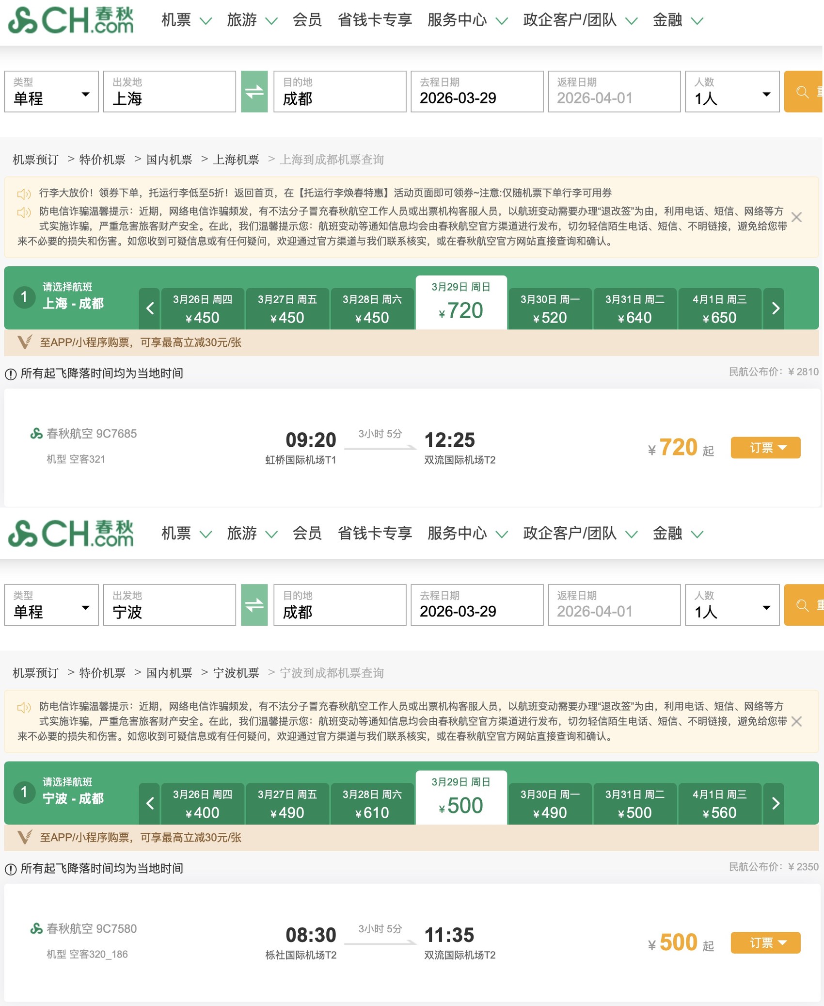 春秋航空也将在3月29日至10月24日期间,在双流机场新增两条定期航线,分别为上海虹桥—成都双流、宁波—成都双流,均为每日一班。目前,上述两家航司相关航班机票已上线销售。