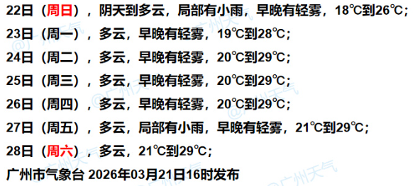 广州市气象台预计,3月22日白天起,广州渐转多云天气,早晚有轻雾,气温由18~26℃逐渐回升至20~29℃。