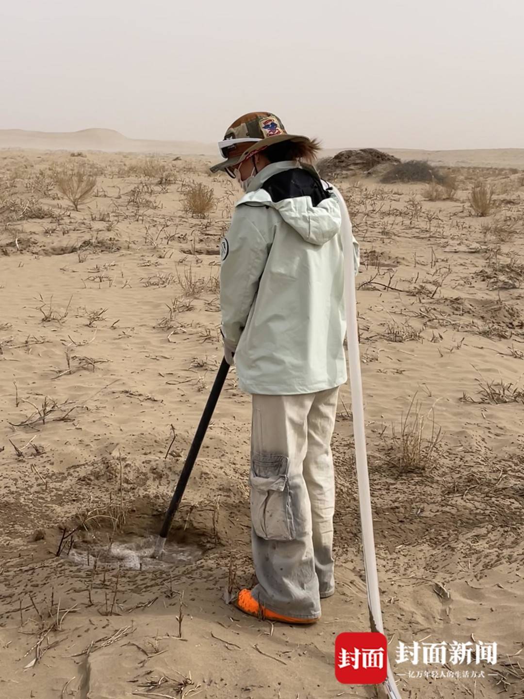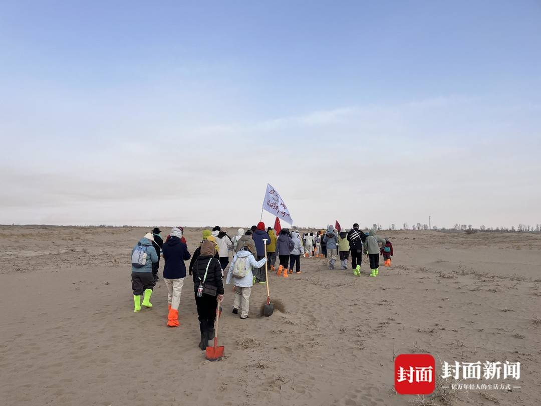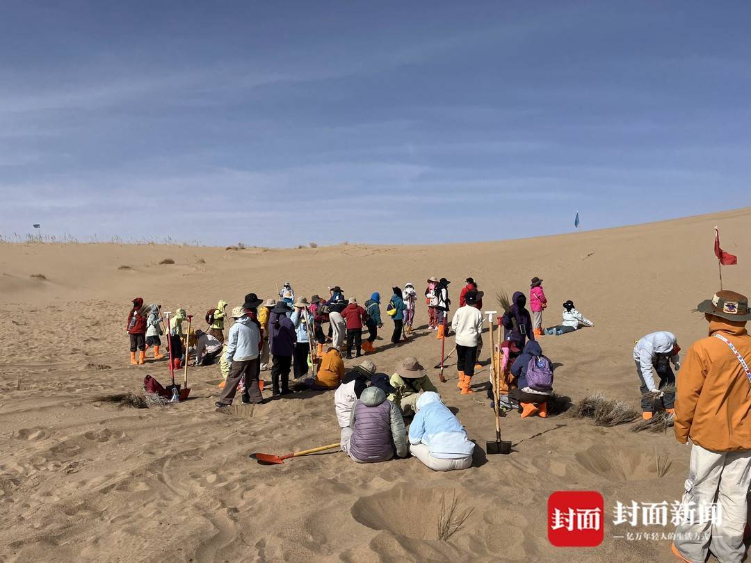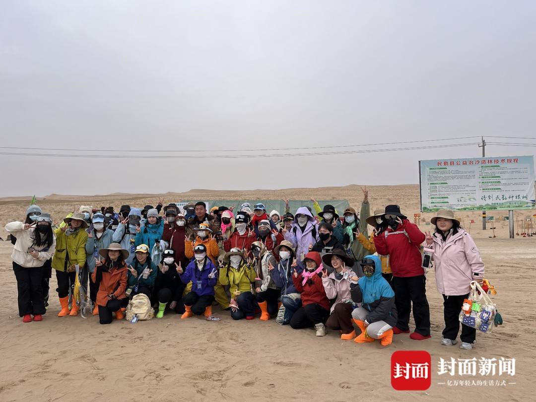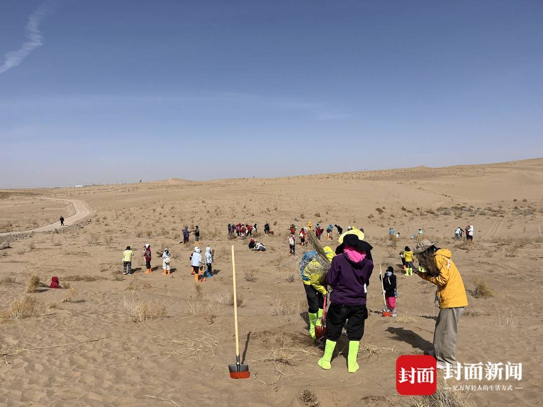 挖坑、扶苗、培土、踩实、浇水……在风沙肆虐的荒漠中,这些拿着铁锹,用头巾包住口鼻,只露出一双眼睛的志愿者们正干得热火朝天。其中,有每年都要从江南水乡跋涉而来植树的热心公益人士,也有受综艺影响初体验治沙的“00后”,还有年过40岁踏上荒漠植树的女性。在她们的讲述中,能看到治沙的故事在民勤这片宽阔的土地上被书写、延续。