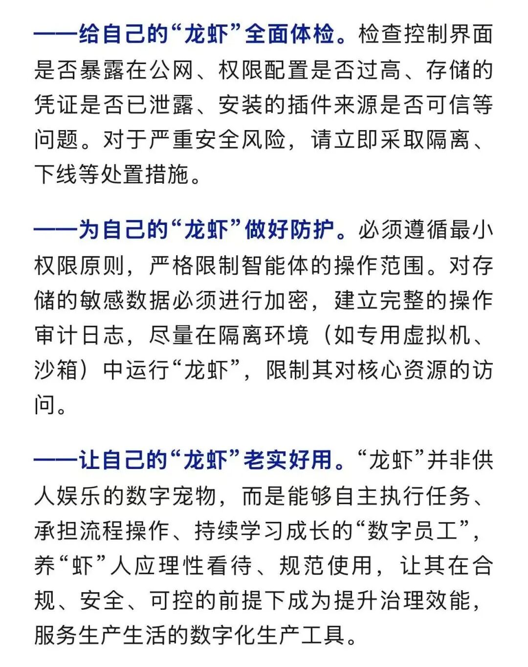 OpenClaw(昵称“龙虾”)是一款开源AI智能体工具,上线不久便迅速成长为2026年度现象级“开源奇迹”。不少用户从付费安装“龙虾”,到付费卸载“龙虾”,养“龙虾”正在成为一场智能体的狂欢。但火热的“龙虾”在创新改变生活的同时,也存在原生风险。国家安全部特别提示,广大用户要理性辨别、规范使用,以积极的心态和慎重的执行拥抱人工智能时代,让“龙虾”成为遵规守纪、产能高效的“数字员工”。