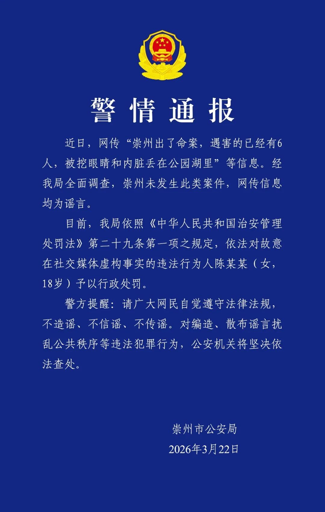 2026年3月22日,成都崇州市公安局发布警情通报: