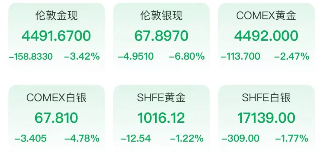 本周,国际市场上金银等贵金属价格延续跌势,纽约商品交易所4月交割的黄金期价从上周五的每盎司5061.70美元一路下挫,到本周五已跌破每盎司4600美元关口,全周累计下跌9.62%,创下15年来最大的单周跌幅;纽商所5月交割的白银期价则从每盎司80美元上方,跌破70美元,全周累计跌幅超过14%。另外,伦敦现货黄金跌破每盎司4500美元,本周累计跌超11%,连续第八个交易日下跌。