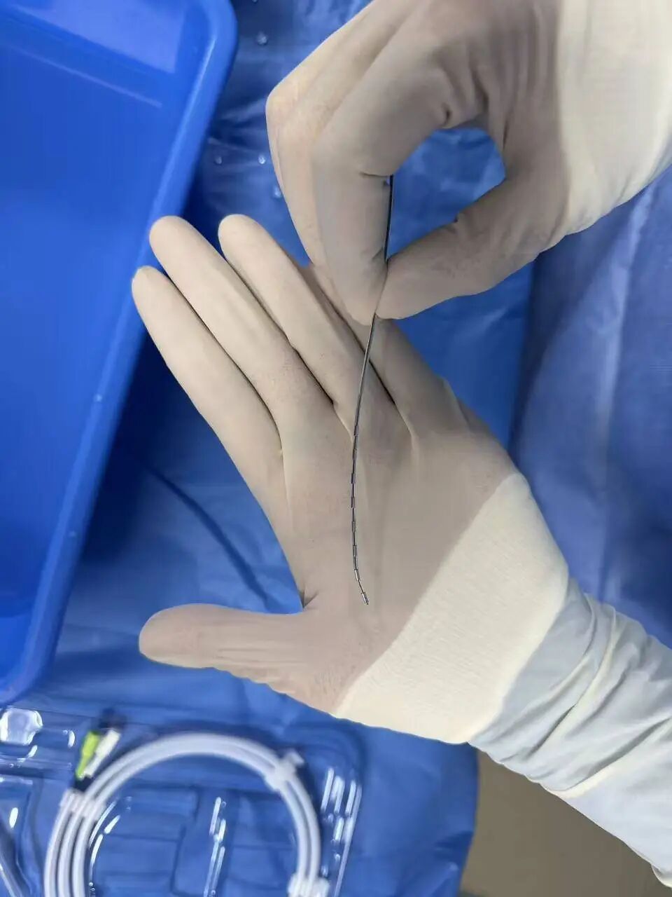 在脑机接口神经调控手术中,医生在吴女士体内植入“脊髓神经刺激测试电极”。(大冶市中医医院供图)