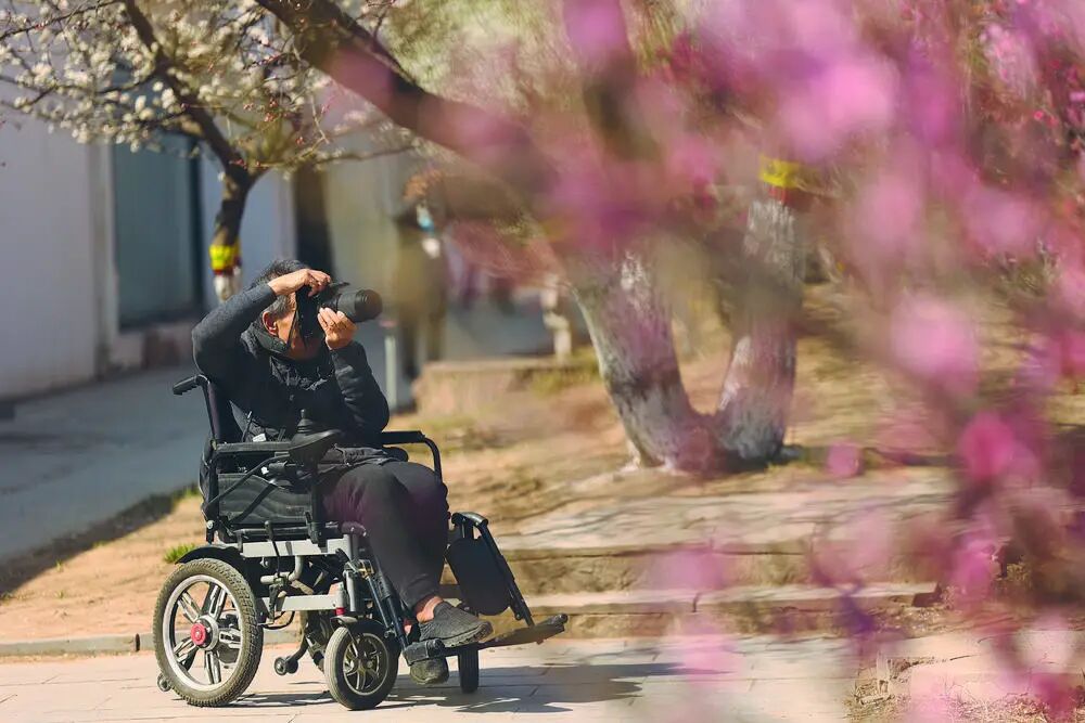 陈大爷坐着轮椅拍摄梅花。
