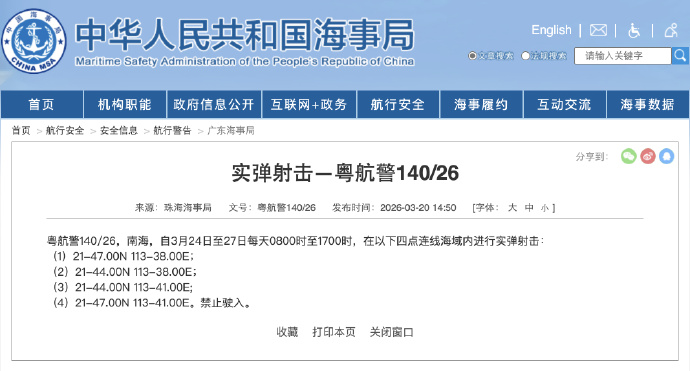据中国海事局网站消息,珠海海事局发布航行警告,3月24日至27日每天8时至17时,南海部分海域进行实弹射击,禁止驶入。
