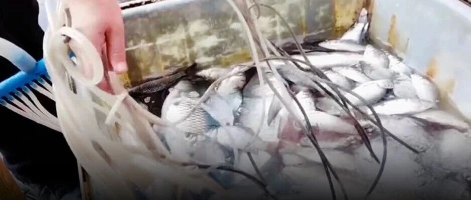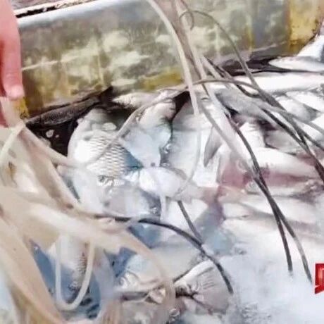 在运输环节上,记者看到工人往装活鱼的桶里加一瓶盖液体搅拌后,活蹦乱跳的鱼瞬间安静瘫软。