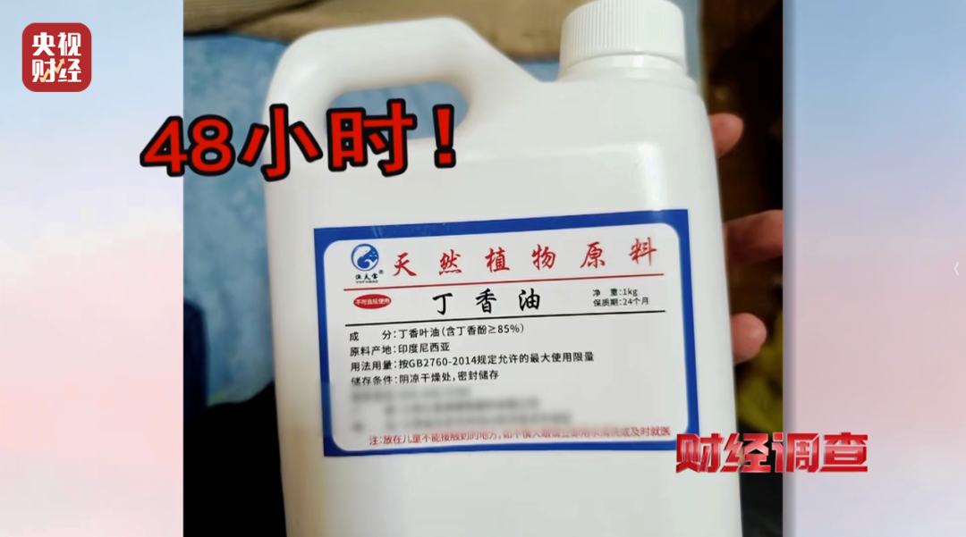 记者找到江西吉安一家生产丁香酚的厂家,厂家承认原料从印尼进口,以食品添加剂名义出厂,被鱼贩子用于麻醉活鱼。一些小作坊购买原料后包装成“三无”麻药流入市场。厂家告知记者,丁香酚在鱼体内完全代谢至少需48小时。