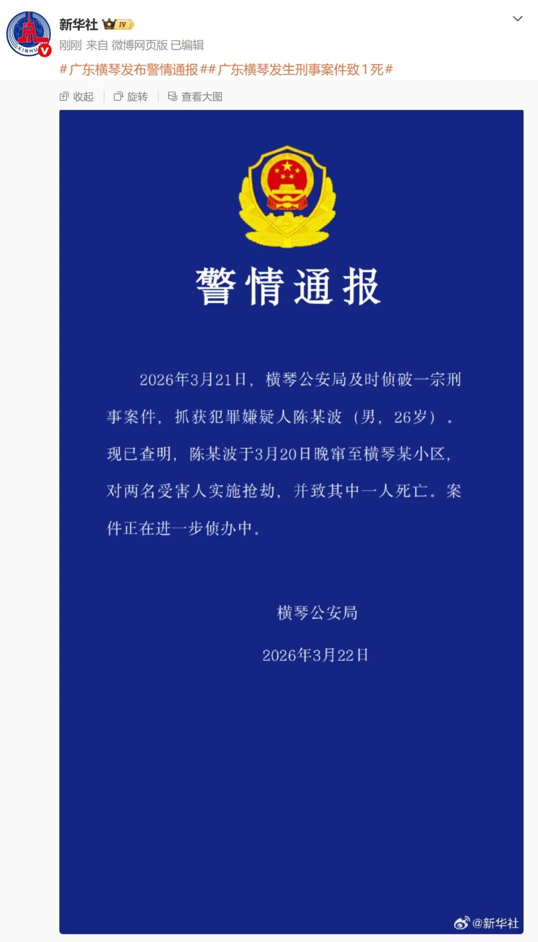 2026年3月21日,横琴公安局及时侦破一宗刑事案件,抓获犯罪嫌疑人陈某波(男,26岁)。现已查明,陈某波于3月20日晚窜至横琴某小区,对两名受害人实施抢劫,并致其中一人死亡。案件正在进一步侦办中。