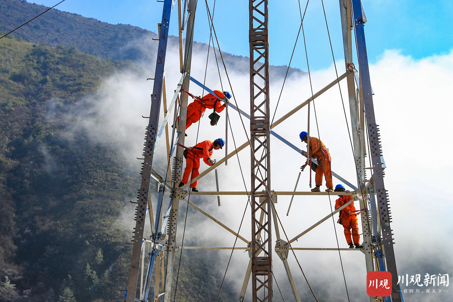 2020年11月25日,在海拔超过3000米的雅安泥巴山上,国网雅安荥经县供电公司工作人员正加班加点进行电线改造工作。视觉四川 黄刚摄