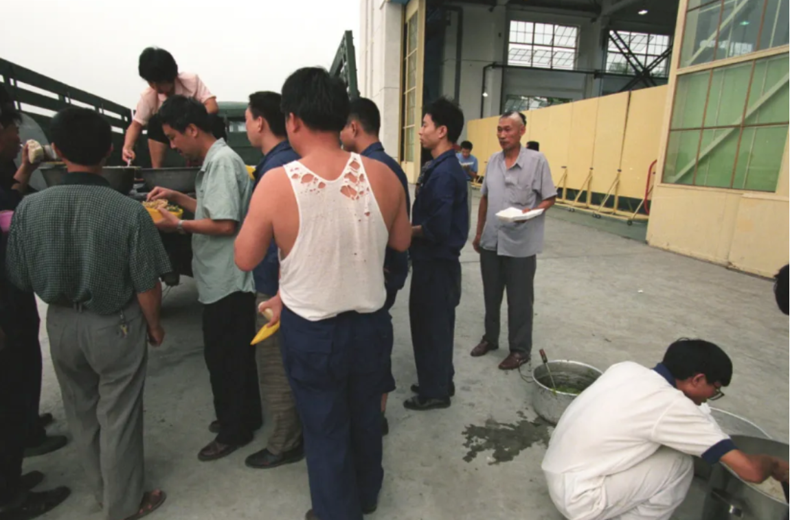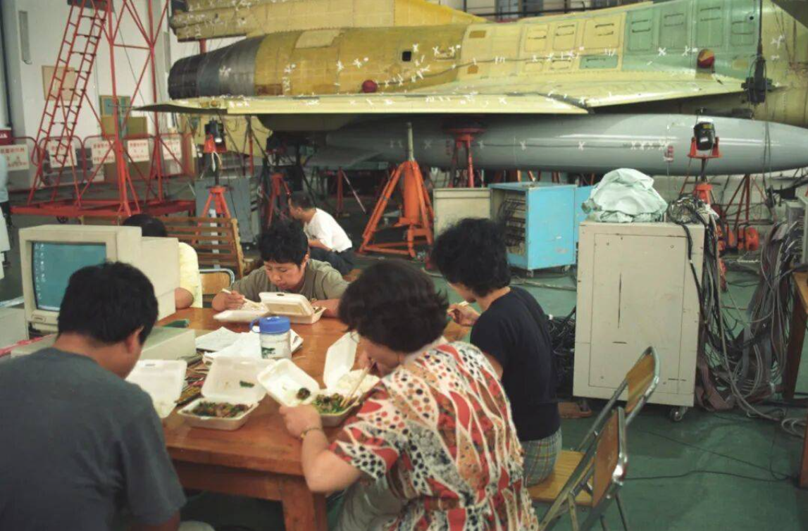 那是1997年的一个夏天,试飞站内闷热如蒸笼,众人为抢进度连续加班,饭食直接送到现场。李勇刚端起饭盒,就瞥见一个背影——一个工作人员穿着一件破洞背心正在打饭。“那件背心已经磨破了,汗渍斑斑,看到那个场景,我感触很深,在90年代艰苦的环境下,一群航空人勒紧裤腰带,一心干好歼-10。”想到这里,李勇立马放下饭盒,对准背影按下快门。