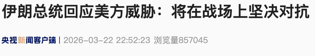 当地时间22日傍晚,伊朗总统佩泽希齐扬在社交媒体发文表示,“企图‘将伊朗从地图上抹去’,是对一个创造历史的国家意志的绝望践踏。威胁和恐吓只会增强伊朗的团结。霍尔木兹海峡对所有人开放,唯独侵犯伊朗领土者除外。伊朗将在战场上坚决对抗这些疯狂的威胁。”