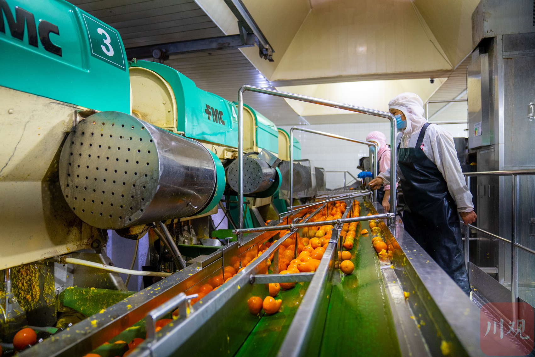 时间接近中午,一辆辆大型冷藏货柜车从四川佳美食品工业有限公司大门驶出。车间内,黄橙橙的新鲜脐橙跳跃着进入生产线,经过筛选、清洗,被输送进榨汁机,一股甜蜜的芳香弥漫整个厂房。