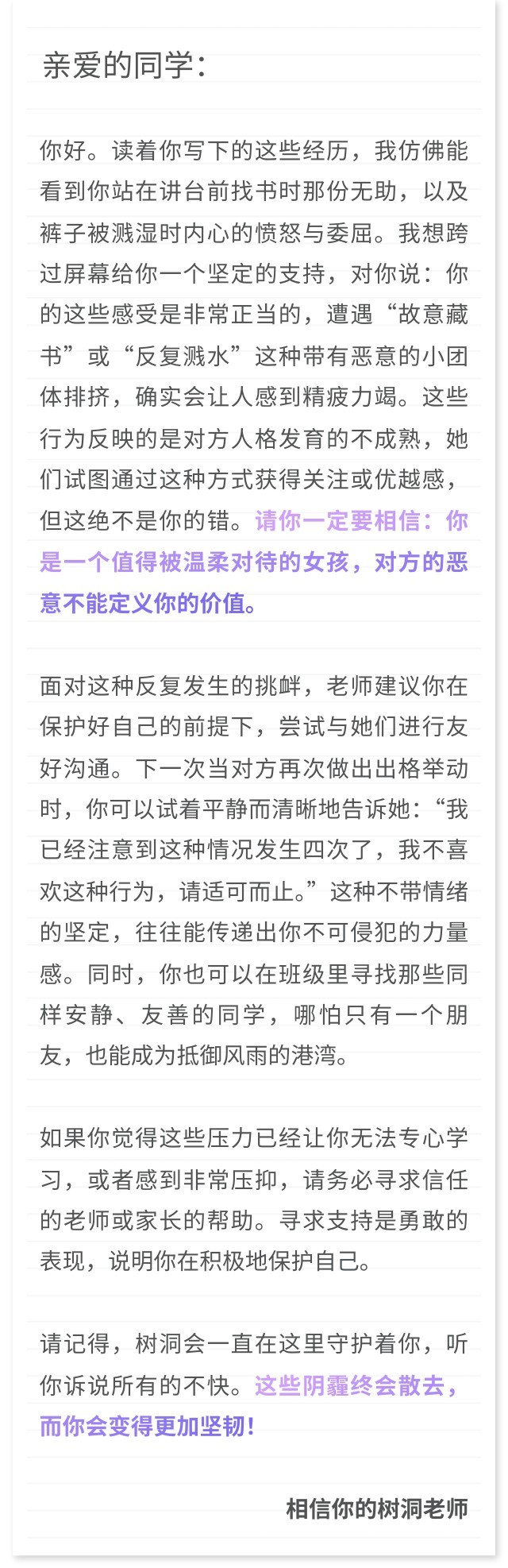 一位16岁高中女生:遭遇同学“故意藏书”、“故意把地上的水溅裤子上且已经连续四次”等小团体排挤行为,感到非常委屈。