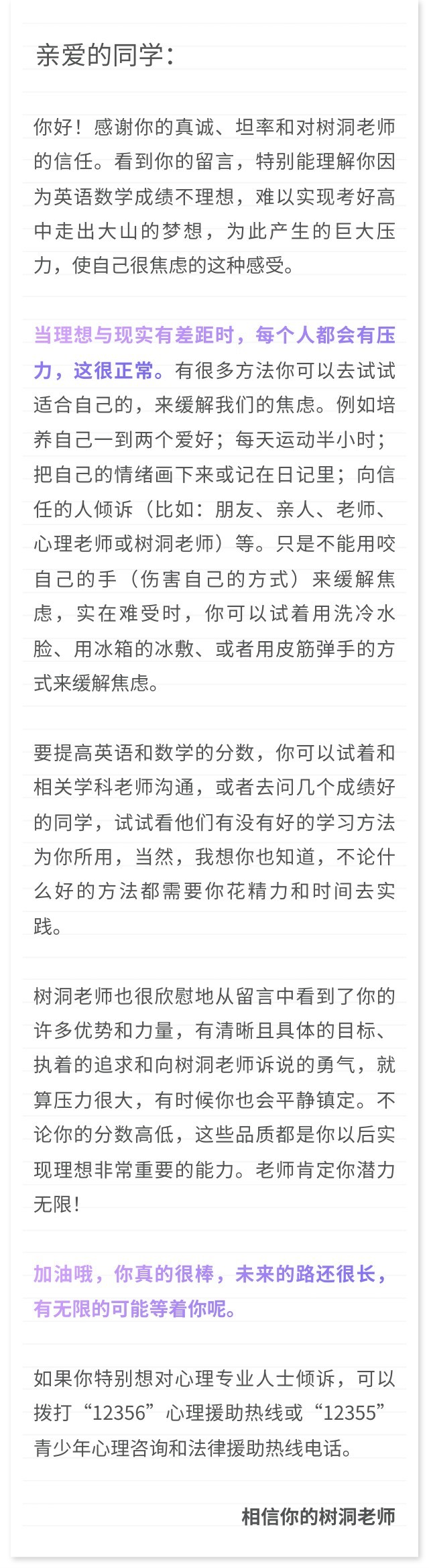 一位17岁初中女生:我英语很差,希望中考的时候能考70分,能考个好高中。希望走出大山,去更好更远的学校读。一想到我的数学和英语成绩,我的眼泪就会不自觉地落下来。我怕我考不到好高中,我真的很想读书。有时候我会迷茫慌张。但有时候我也会平静镇定。
