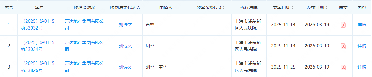 同日,因商品房预售合同纠纷一案,万达地产及其法定代表人刘诗文还新增三条限制消费令,执行法院为上海市浦东新区人民法院。
