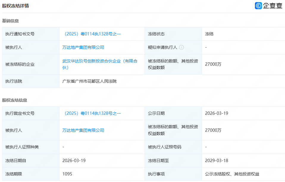 据企查查,万达地产集团有限公司(以下简称“万达地产”)于3月19日新增一则股权冻结信息,股权所在企业为武汉华达玖号创新投资合伙企业(有限合伙),冻结股权数额2.7亿元人民币,冻结期限3年,执行法院为广东省广州市花都区人民法院。