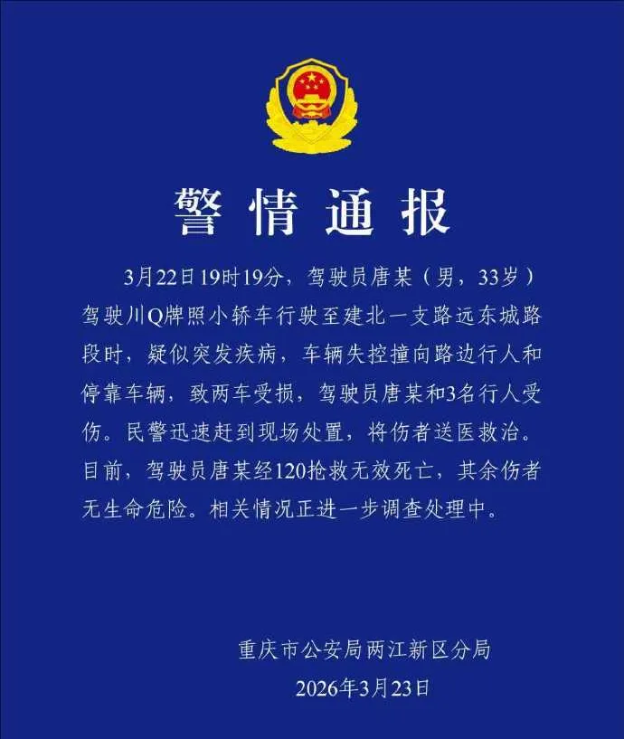 3月22日19时19分,驾驶员唐某(男,33岁)驾驶川Q牌照小轿车行驶至建北一支路远东城路段时,疑似突发疾病,车辆失控撞向路边行人和停靠车辆,致两车受损,驾驶员唐某和3名行人受伤。伤者已被送医救治。目前,驾驶员唐某经120抢救无效死亡,其余伤者无生命危险。相关情况正进一步调查处理中。