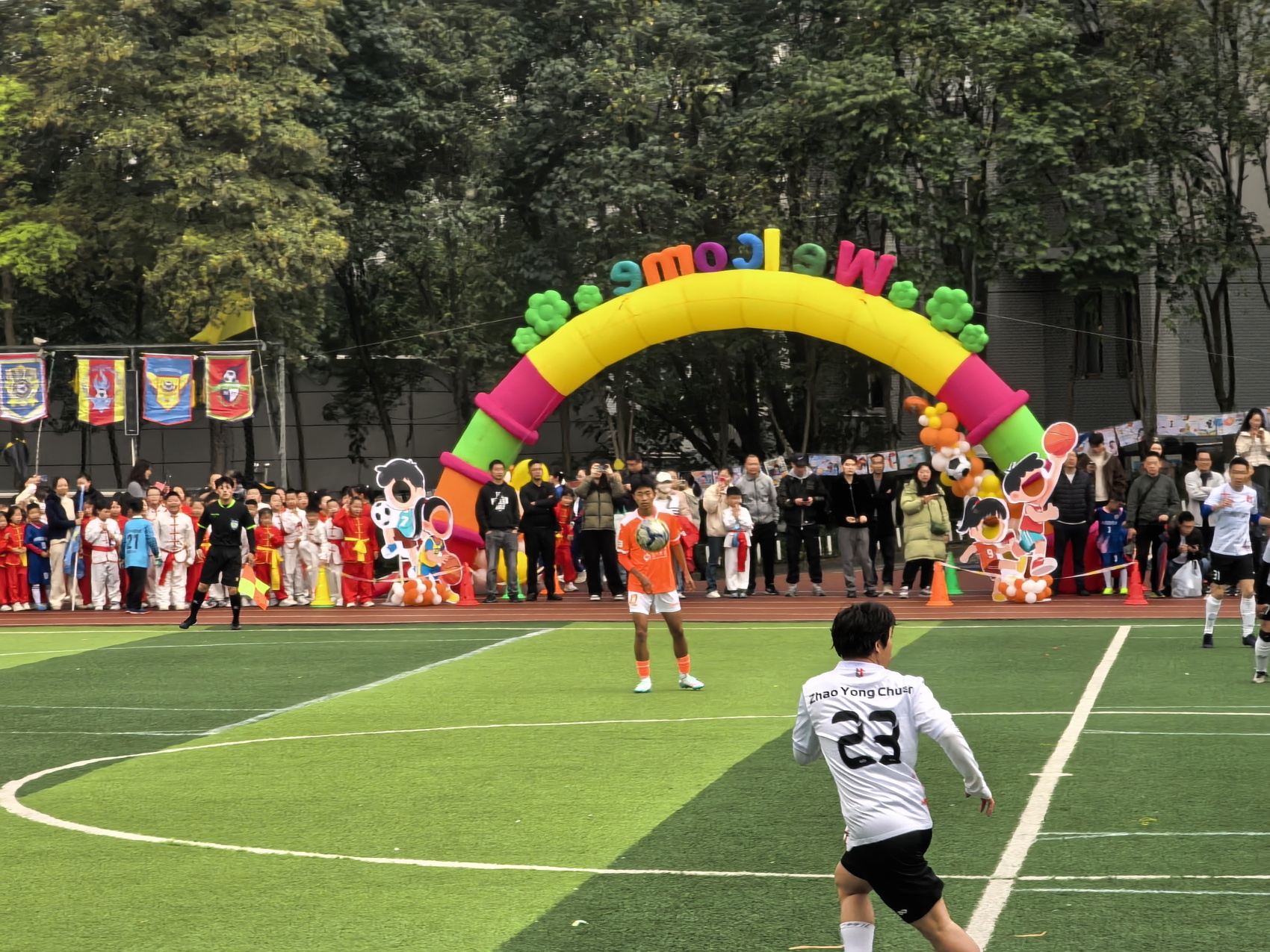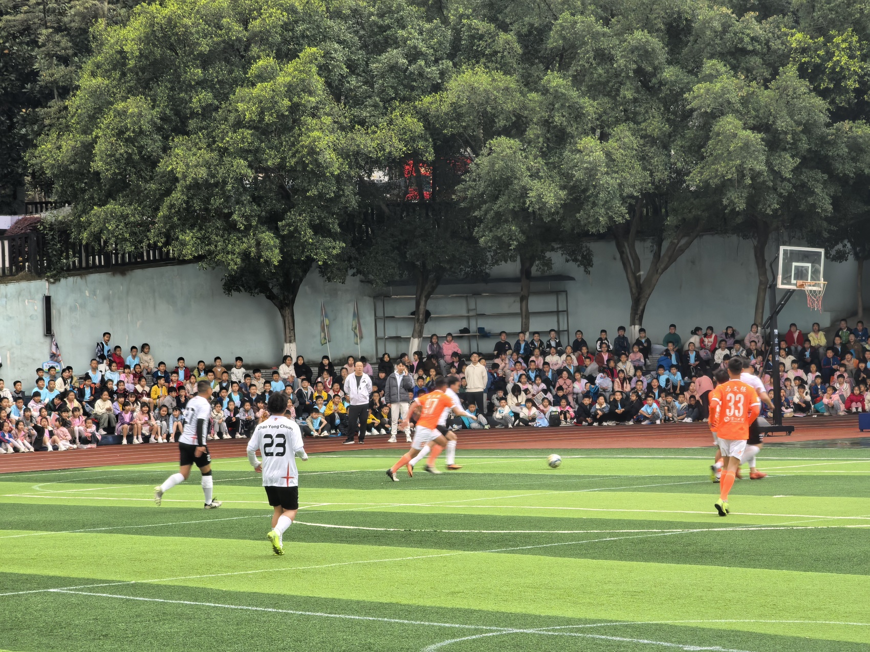 “好球!”“再进一个!”3月23日,泸州市梓橦路学校的绿茵场上格外热闹。由教师、家长组成的梓橦家校荣耀队主场迎战川超泸州窖香队,展开激烈对抗。场边围观的同学们不时爆发出阵阵欢呼与惋惜声,加油声此起彼伏,把现场氛围推得火热。