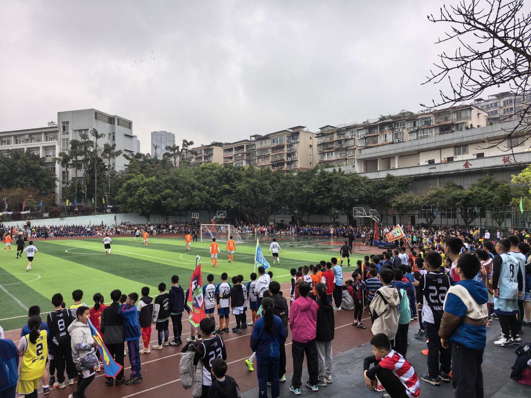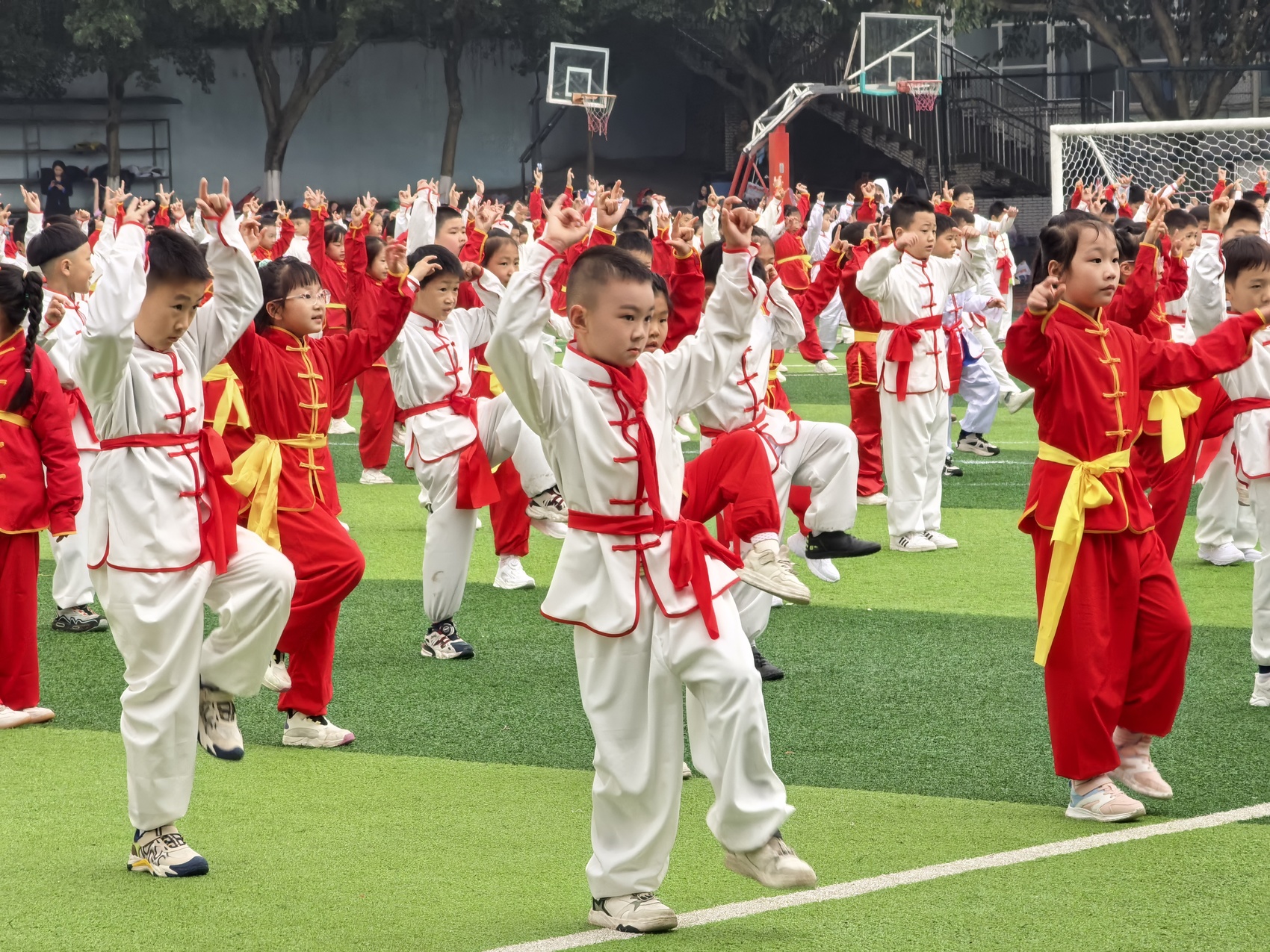 这场热闹的比赛,是该校第九届校园足球联赛暨2026年班级篮球联赛开幕式的一部分。开幕式上,从一年级到六年级的学生方队依次入场,精神饱满。