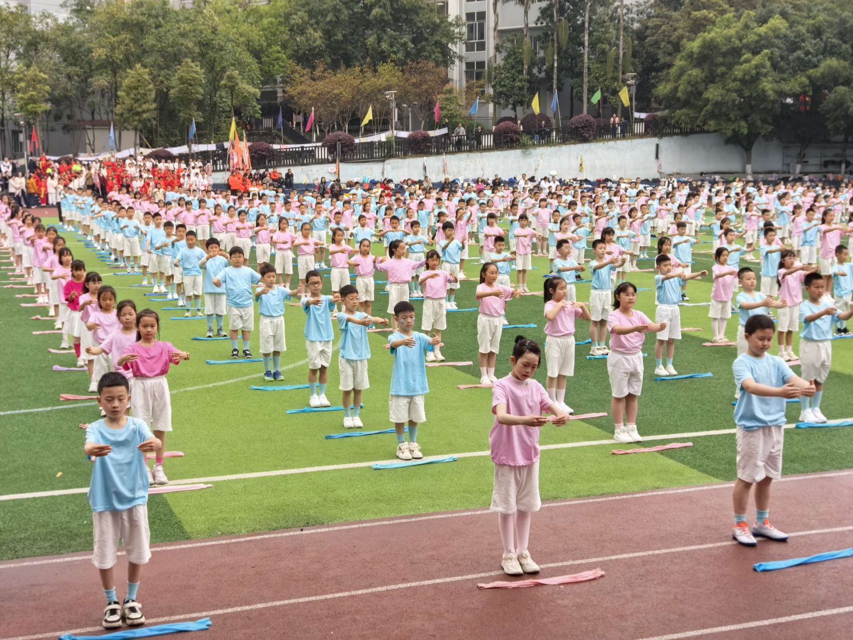 表演环节也同样精彩,二年级的孩子们带来了少儿五禽戏,模仿虎、鹿、熊、猿、鸟的动作,一招一式认真又可爱,把传统养生智慧展现得生动有趣。三年级的弹力带操则是学校的原创节目,由体育、音乐、舞蹈老师共同设计,既锻炼了力量,又融入了芭蕾的优雅,让人眼前一亮。师生们还带来了节目《吉量》,2026年是马年,大家用舞蹈和歌声演绎《山海经》里的神马,传递出满满的活力。
