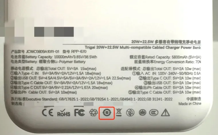 画圈处为充电宝上的电池可循环使用5年年限标识