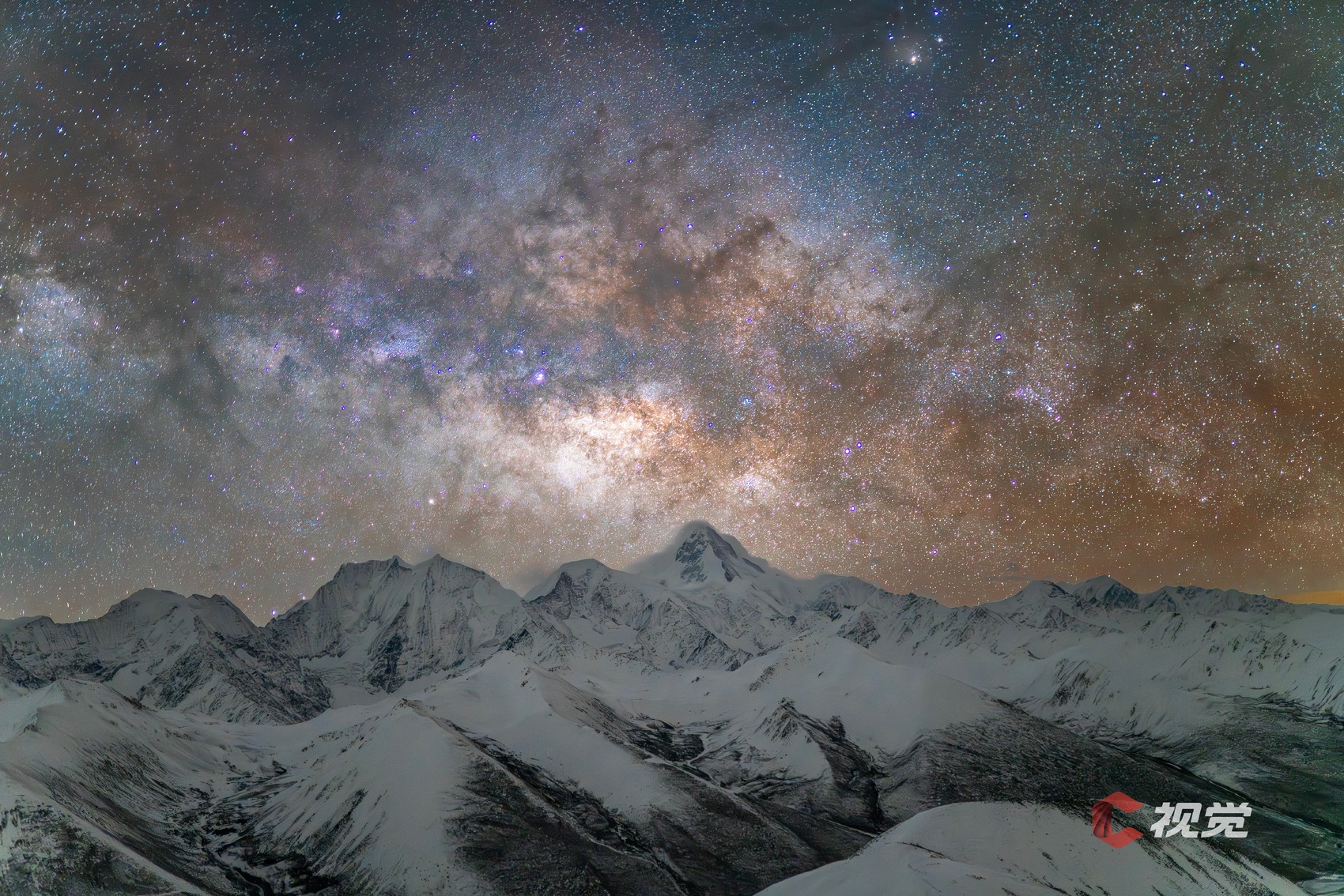 3月19日凌晨,在甘孜康定雅哈垭口,贡嘎雪峰皑皑而立,“多巴胺色”的银河横跨天际。