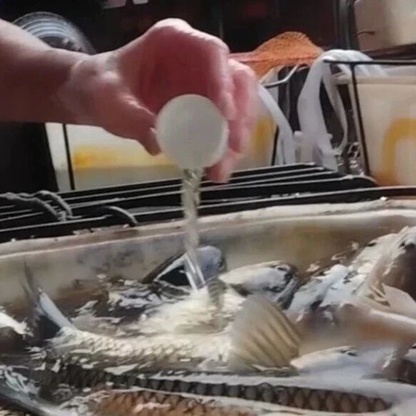 在运输环节上,记者看到工人往装活鱼的桶里加一瓶盖液体搅拌后,活蹦乱跳的鱼瞬间安静瘫软。
