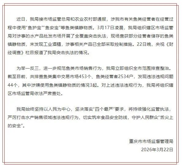 3月22日晚,重庆市市场监督管理局发布情况通报。通报称,近日,该局接市场监管总局和农业农村部通报,涉重庆市有关鱼类经营者在经营过程中使用“鱼护宝”“鱼安宝”等鱼类镇静物质。3月17日凌晨,该局组织辖区市场监管局对涉事的水产品批发市场开展了全覆盖突击执法,现场查获部分经营者储存的鱼类镇静物质,未发现工业酒精,涉事相关产品已全部采取控制措施。
