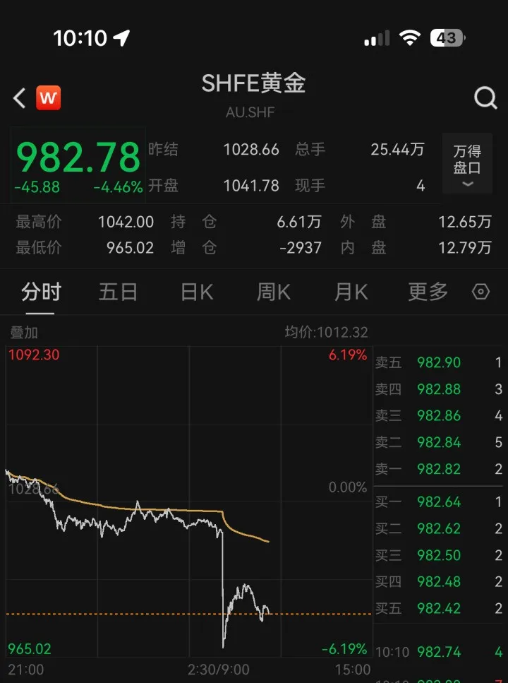 3月23日上午,国内金价迅速跌破1000元。截至发稿,报982.78元/克,日内跌幅超4%。