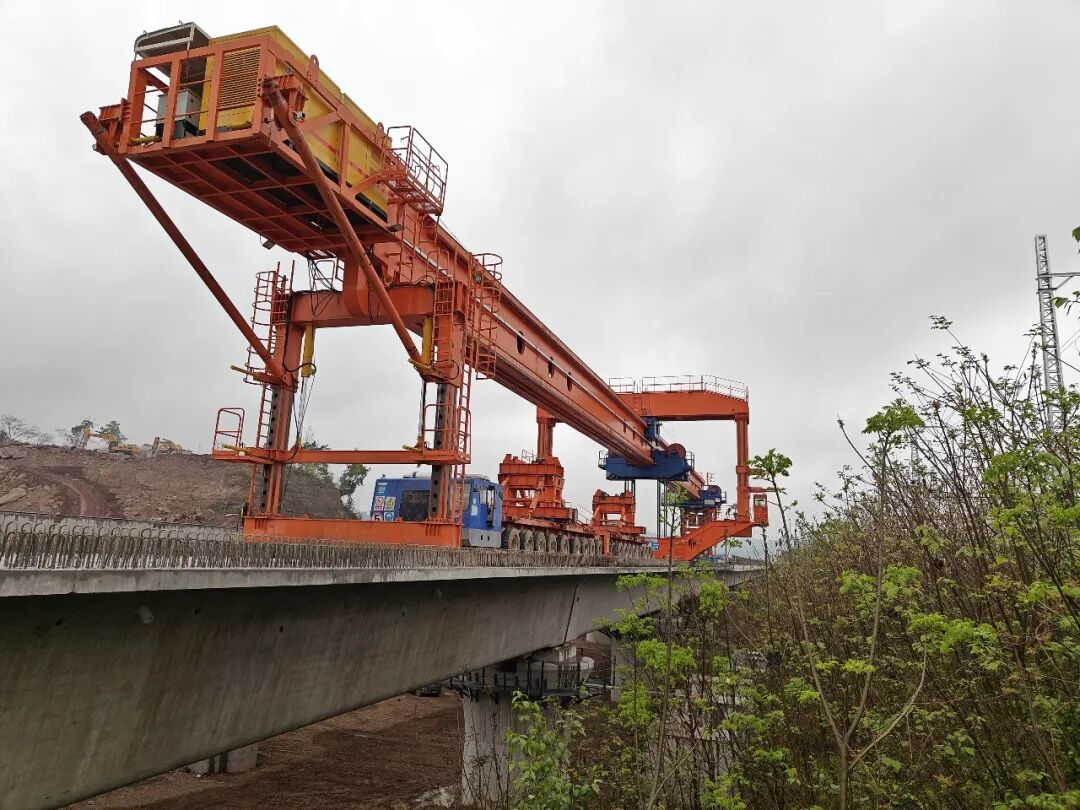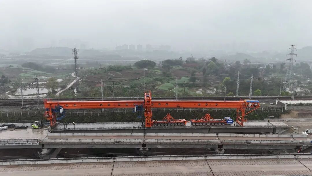 项目团队严格按照专项方案施工,采用国产900吨高铁箱梁架桥机,搭配视频监控、智能监测装置实时管控作业,及时预警纠偏,确保施工安全有序推进。