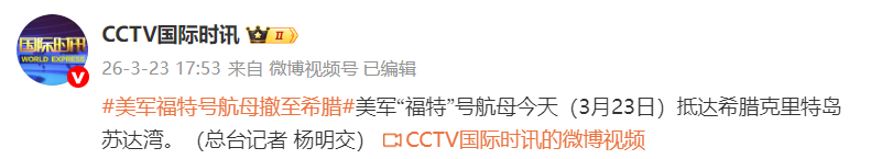 据CCTV国际时讯:美军“福特”号航母今天(3月23日)抵达希腊克里特岛苏达湾。