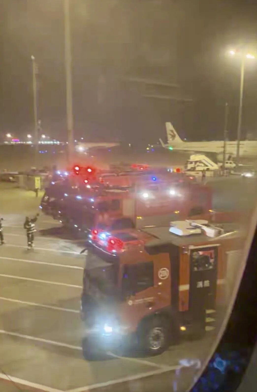 ▲3月22日晚,MU5128次航班落地上海后,多辆机场消防车出动。受访者供图