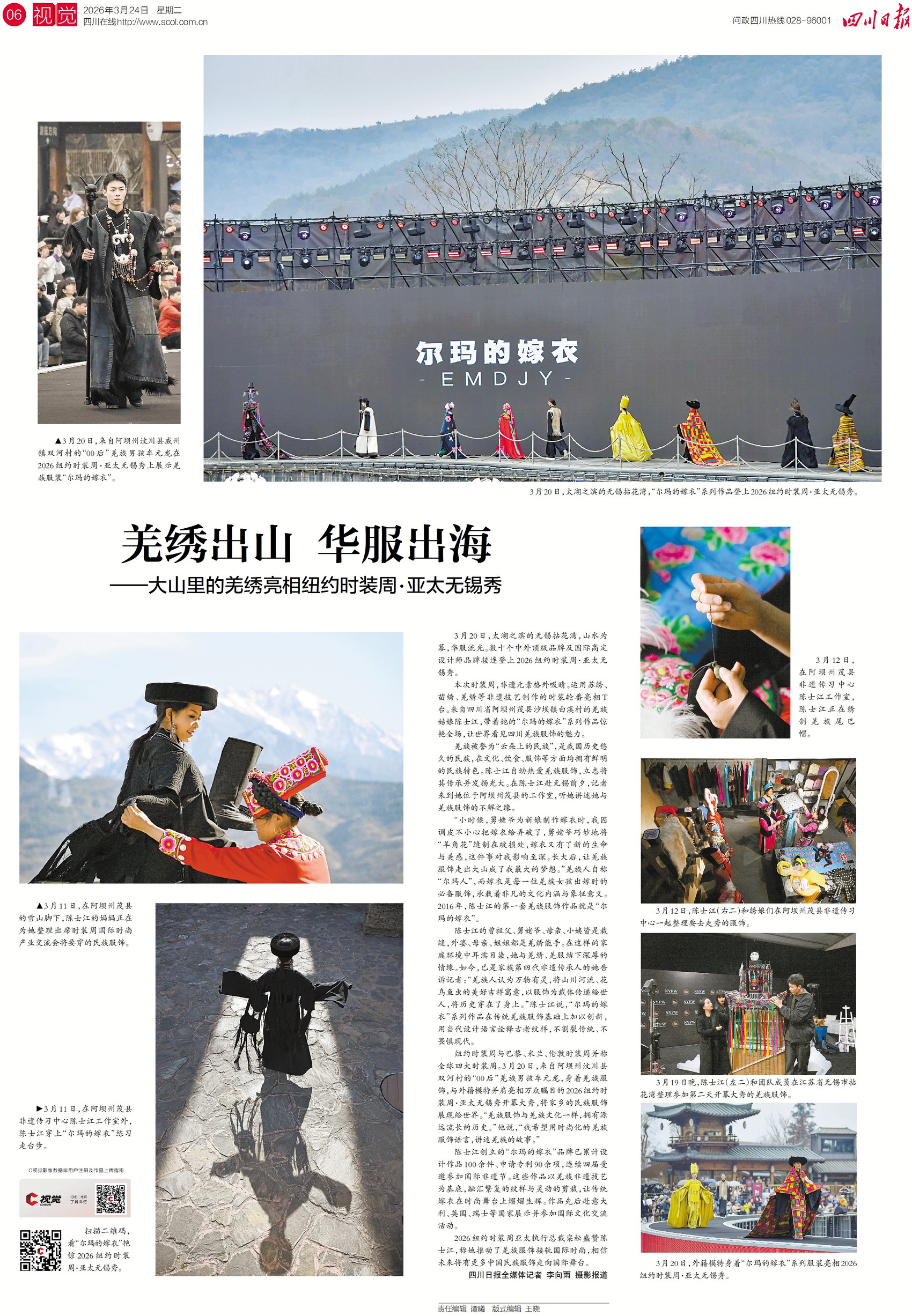 当大山里的羌绣,遇上国际时尚T台,会碰撞出怎样的火花?近日,来自阿坝州茂县的羌族姑娘陈士江,带着她的“尔玛的嫁衣”系列作品亮相2026纽约时装周·亚太无锡站的秀场。她以羌族非遗技艺为基底,用当代设计语言诠释古老纹样,让传统嫁衣在时尚舞台焕发新生。更多精彩瞬间,请关注今日六版。
