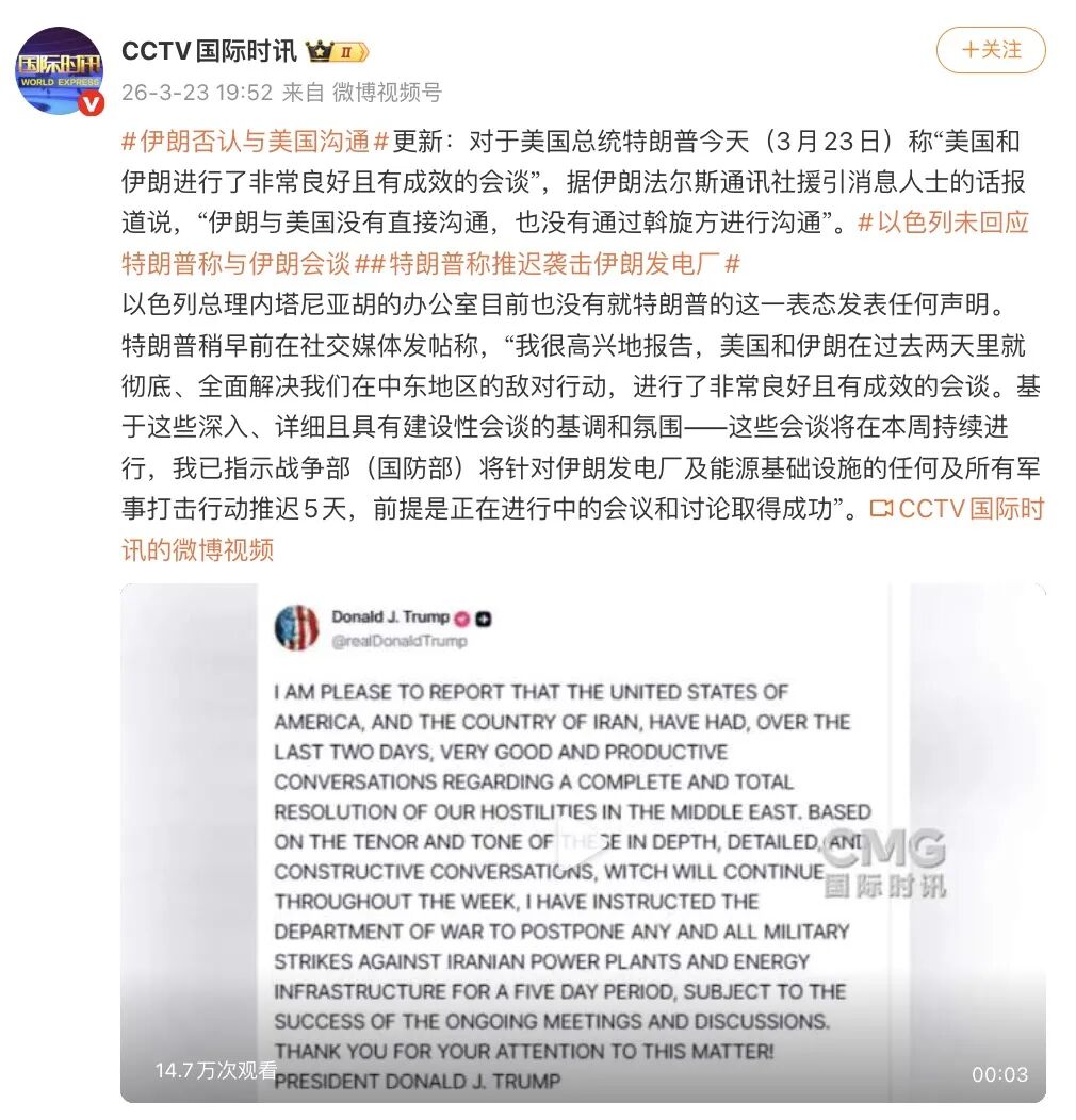 当地时间3月23日,美国总统特朗普在社交媒体平台“真实社交”发文称,“美国和伊朗在过去两天进行了非常良好和富有成效的对话”。