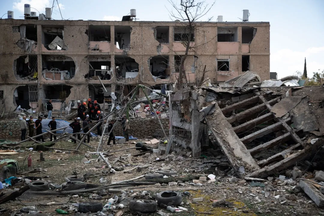 这是3月22日在以色列南部城市迪莫纳拍摄的在导弹袭击中受损的建筑。新华社记者 陈君清 摄