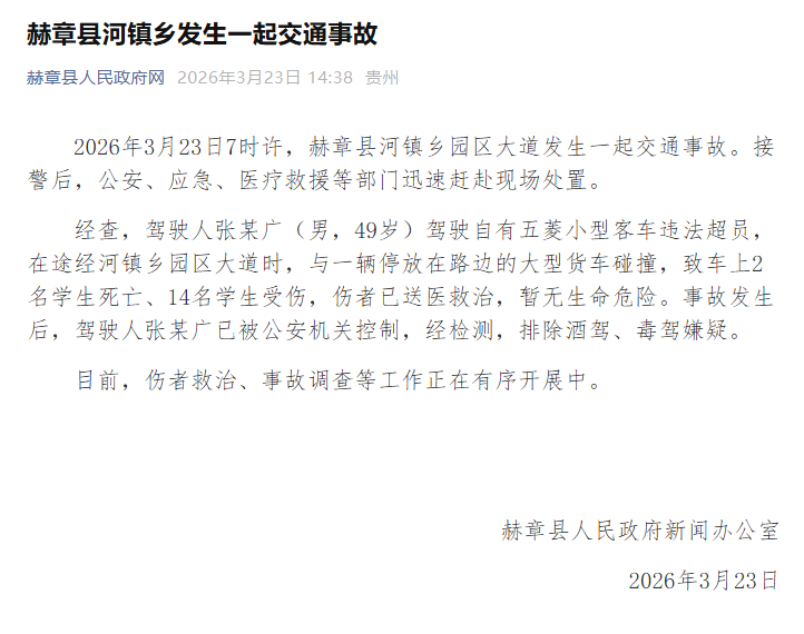 据贵州毕节赫章县人民政府新闻办公室消息,2026年3月23日7时许,贵州省赫章县河镇乡园区大道发生一起交通事故。接警后,公安、应急、医疗救援等部门迅速赶赴现场处置。