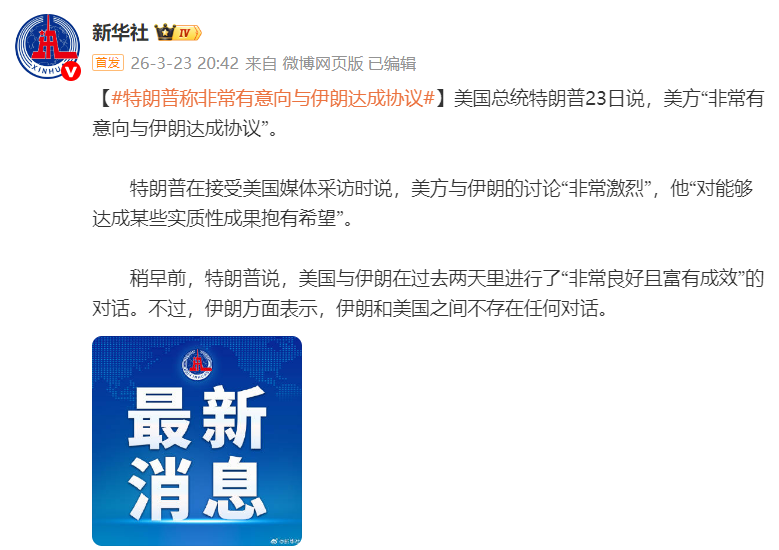 据新华社:美国总统特朗普23日说,美方“非常有意向与伊朗达成协议”。