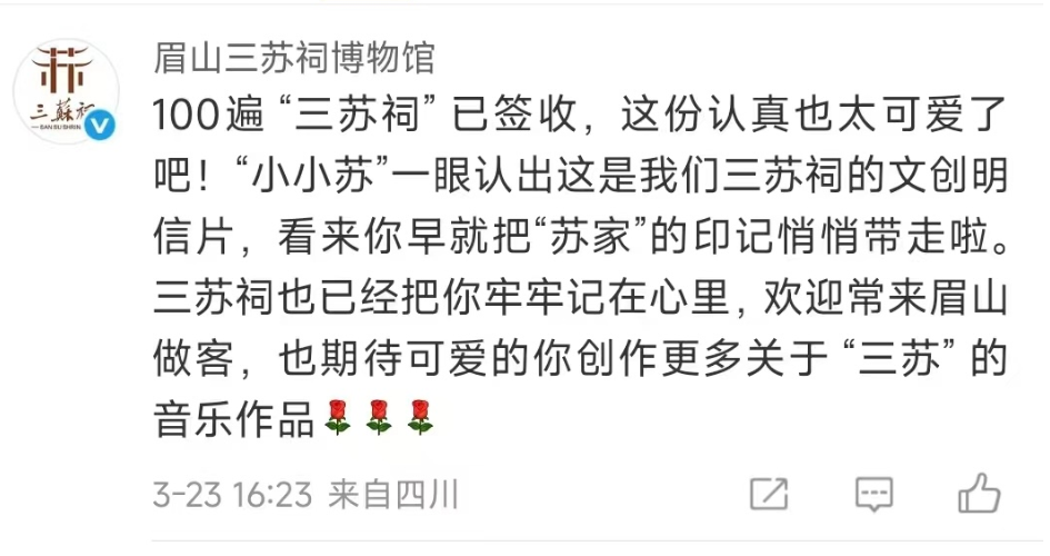 微博发布后,引起了众多网友的热议,不少网友点赞希林娜依·高的真诚和认真。当天下午4时23分,眉山三苏祠博物馆也通过微博留言:100遍 “三苏祠” 已签收,这份认真也太可爱了吧!“小小苏”一眼认出这是我们三苏祠的文创明信片,看来你早就把“苏家”的印记悄悄带走啦。三苏祠也已经把你牢牢记在心里,欢迎常来眉山做客,也期待可爱的你创作更多关于 “三苏”的音乐作品。