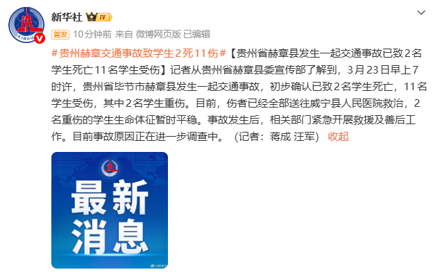 据新华社消息,记者从贵州省赫章县委宣传部了解到,3月23日早上7时许,贵州省毕节市赫章县发生一起交通事故,初步确认已致2名学生死亡,11名学生受伤,其中2名学生重伤。目前,伤者已经全部送往威宁县人民医院救治,2名重伤的学生生命体征暂时平稳。事故发生后,相关部门紧急开展救援及善后工作。目前事故原因正在进一步调查中。