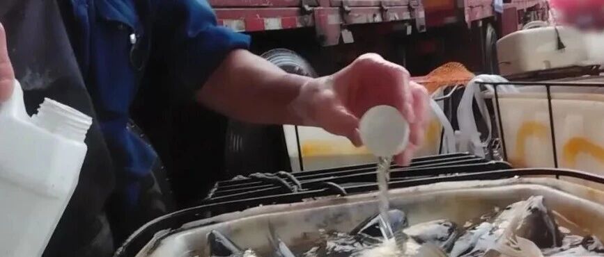 在运输环节上,记者看到工人往装活鱼的桶里加一瓶盖液体搅拌后,活蹦乱跳的鱼瞬间安静瘫软。