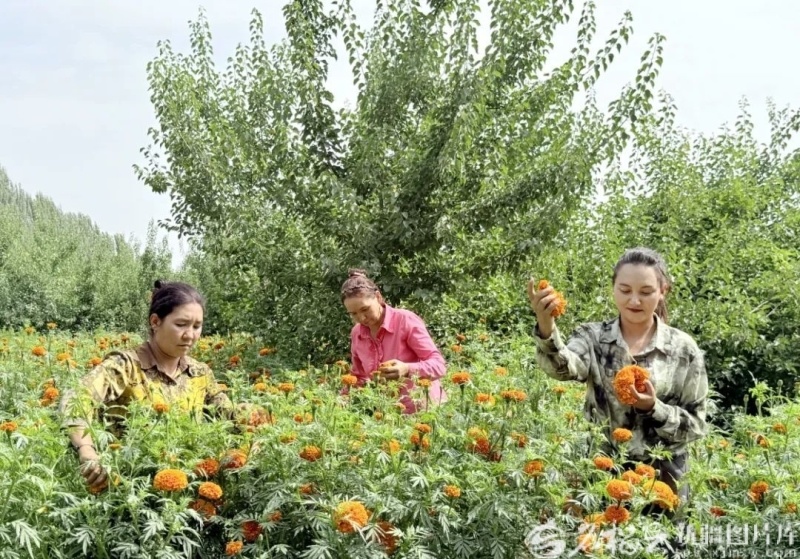 英吉沙县苏盖提乡色日格拉村村民在果园里采收套种的万寿菊(资料图片)。英吉沙县融媒体中心供图