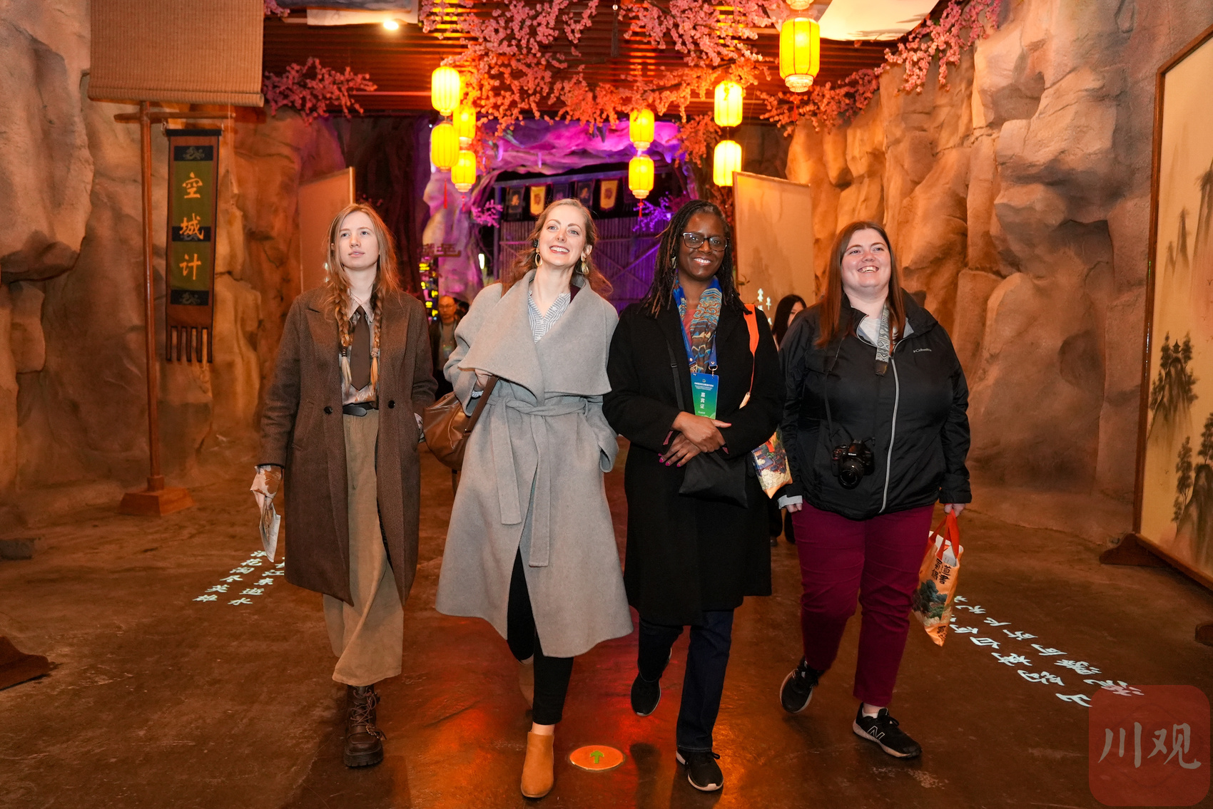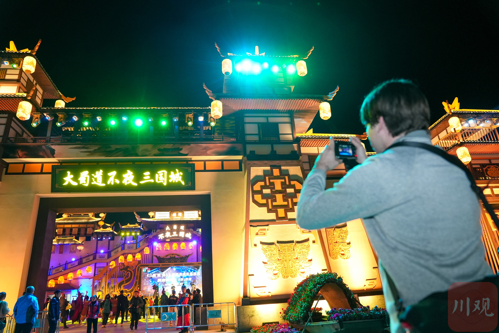 当晚,嘉宾们走进剑阁县大蜀道不夜三国城,沉浸式感受三国文化。据了解,该项目总占地84亩,于2025年8月正式开城运营,涵盖人文三国主题街区、蜀道奇门文化体验区、《三国“眼”绎》超验秀三大板块。项目以蜀道文化为根、三国文化为魂,将高铁站前广场升级为夜间文旅消费集聚区,通过“文化演艺+沉浸街区+潮玩体验”联动,提升游客体验感与美誉度。